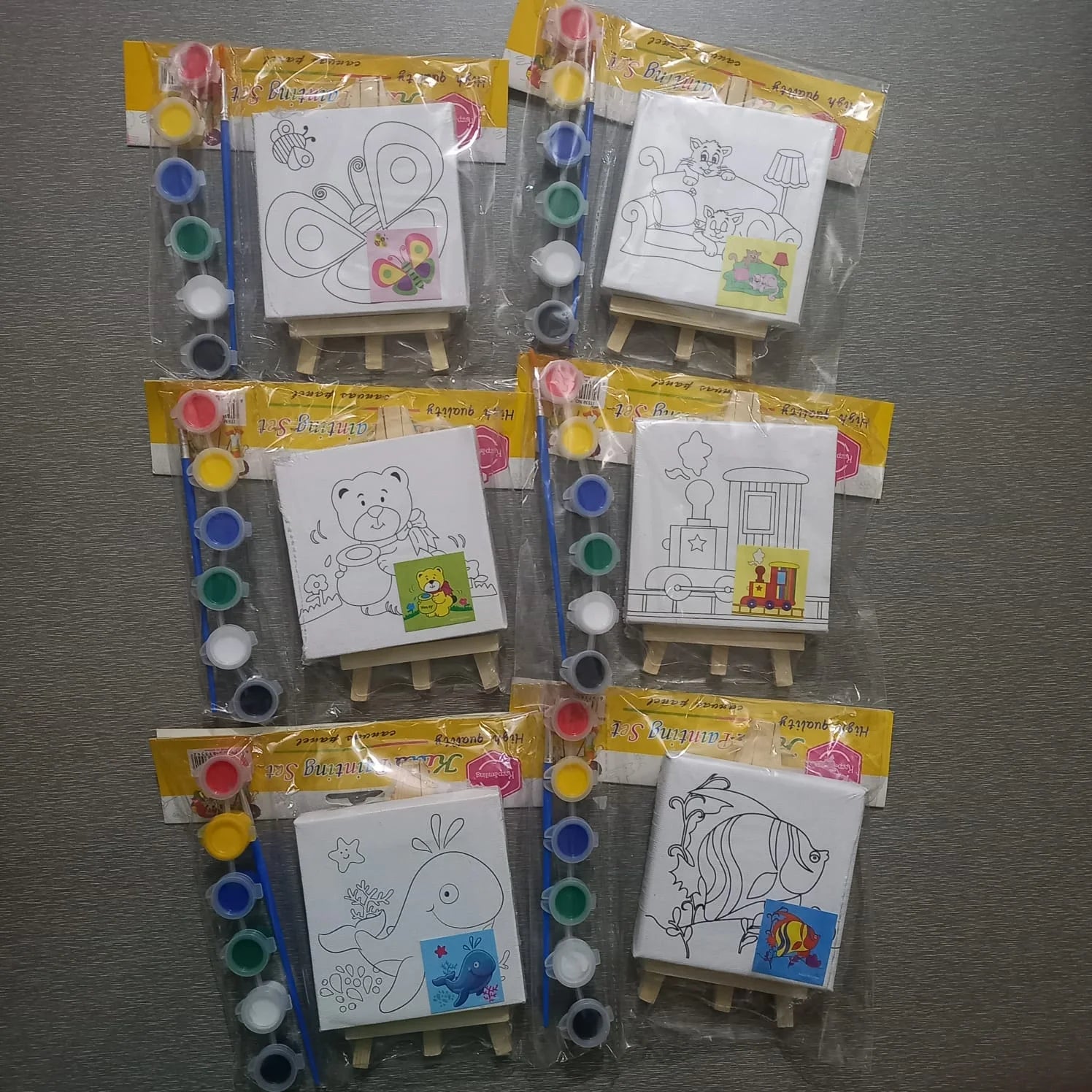 Imported 4in x 4in Different Printed outline Designs Canvas board with wooden stand easel and Acrylic Colours and a Paint Brush
